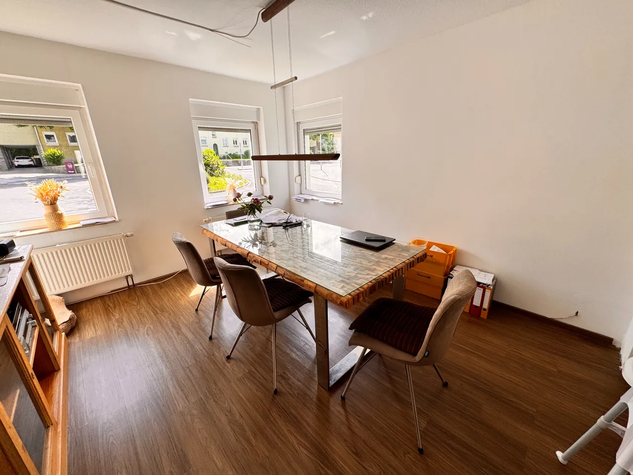 Die Obergeschosswohnung mit ca. 79 m² wurde 2024 umfassend modernisiert. Hier sind eine Diele, Wohnzimmer, offene Küche mit Essbereich, ein Schlafzimmer sowie ein Tageslichtbad mit Dusche angeordnet. Ein Balkon ist ebenfalls vorhanden.