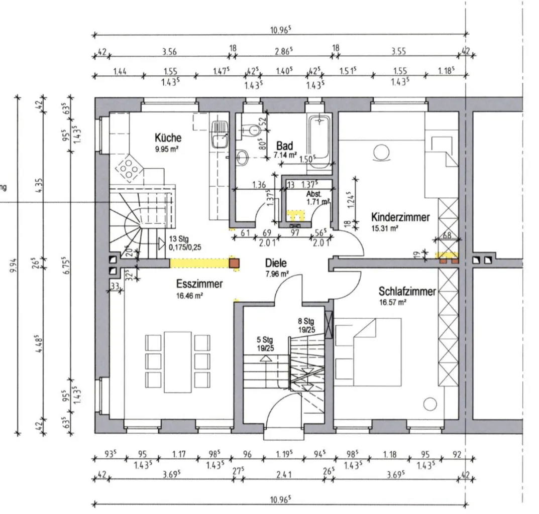 Das Erdgeschoss mit ca. 114 m² verfügt über eine Diele, Esszimmer, Küche, Abstellraum, zwei Schlafräume sowie ein Bad. 2010 wurde die Wohnung um ein Wohnzimmer im Kellergeschoss erweitert. Von hier aus haben Sie Zugang auf die Terrasse und in den Garten.