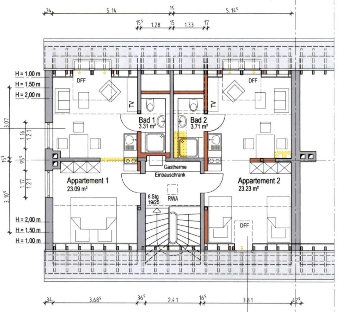 Im Dachgeschoss befinden sich zwei Apartments mit einer Wohnfläche von insgesamt rd. 53 m². Diese verfügen je über einen 2-geteilten Raum mit Schlafbereich, Wohnbereich und einer Kochgelegenheit. Beiden Apartments ist jeweils ein Duschbad zugeordnet.