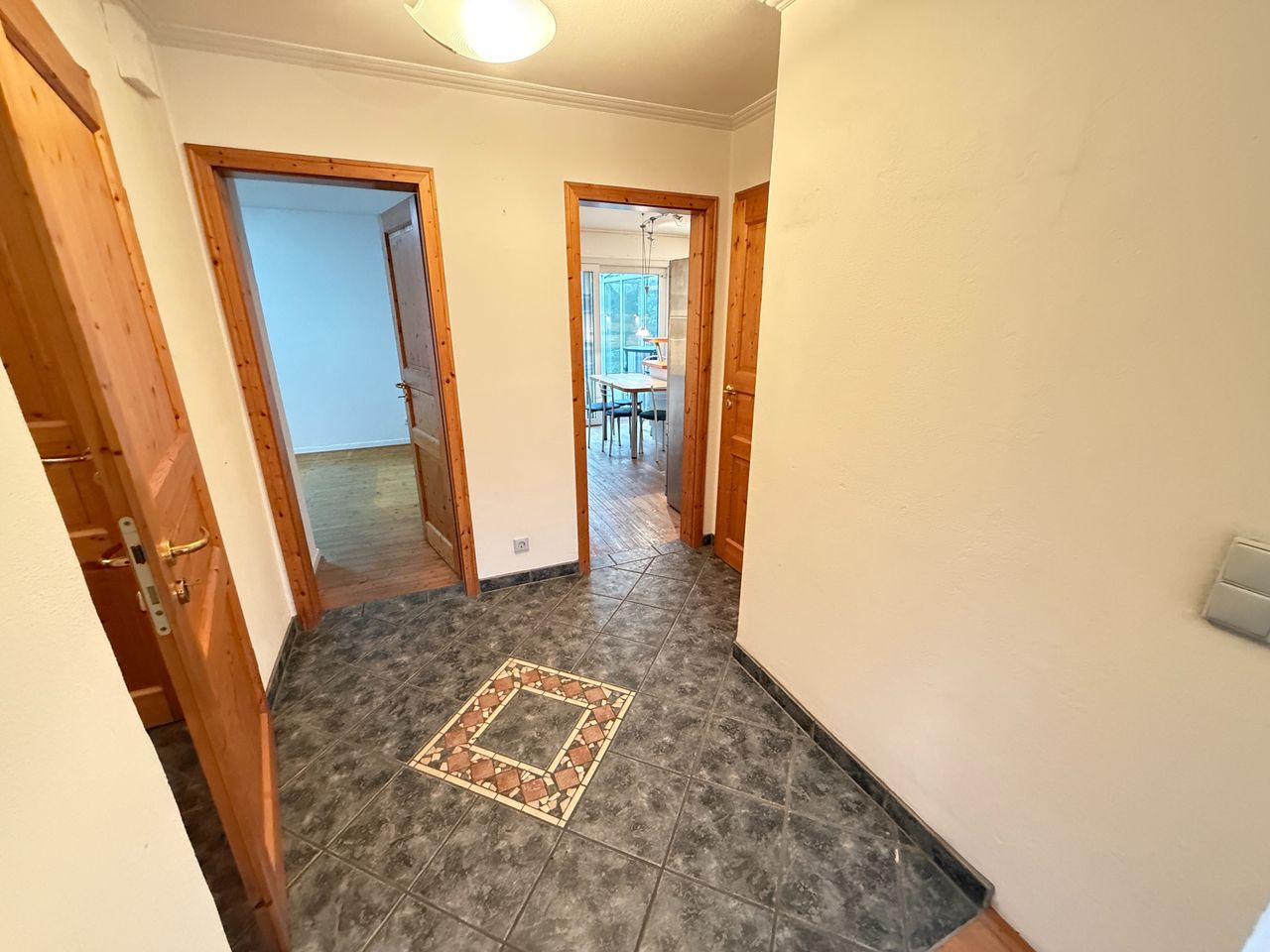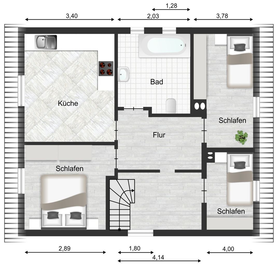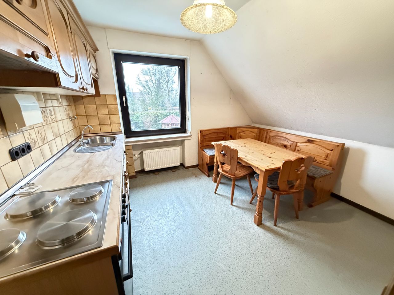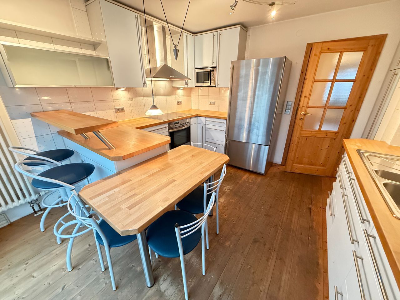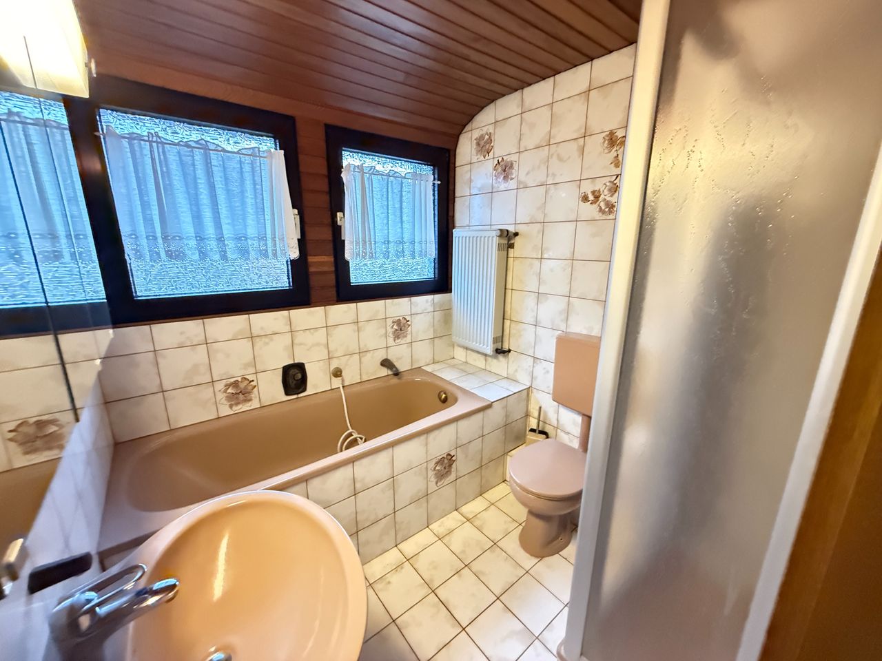 Im Obergeschoss befindet sich die Einliegerwohnung, die aus drei weiteren Zimmern, einer praktischen Kochnische und einem Tageslichtbad mit Badewanne besteht.
