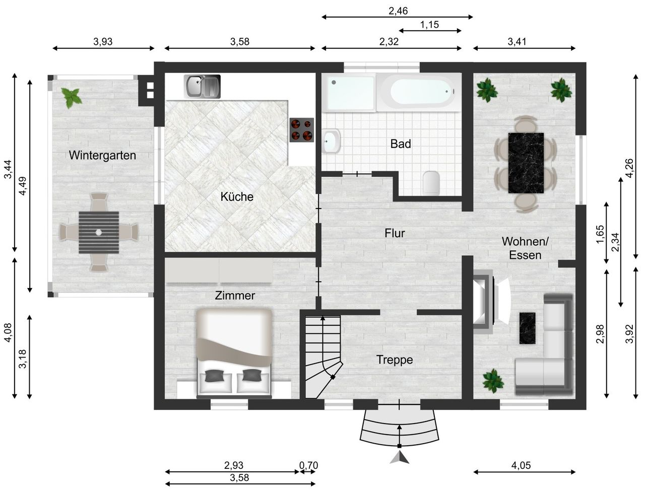 Die großzügige Wohnfläche von ca. 137 m² erstreckt sich über zwei Ebenen. Über einen einladenden Eingangsbereich gelangen Sie in die im Erdgeschoss gelegenen Wohnräume. Hier finden sich die Küche mit angrenzendem Wintergarten, ein lichtdurchflutetes Wohn- und Esszimmer mit Kamin, ein gemütliches Schlafzimmer sowie ein Tageslichtbad mit Dusche. Vom Wintergarten aus, haben Sie Zugang zum pflegeleichten Garten.