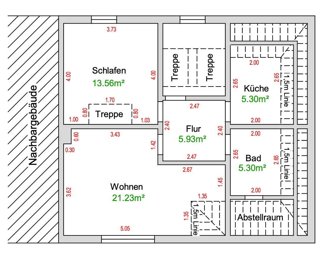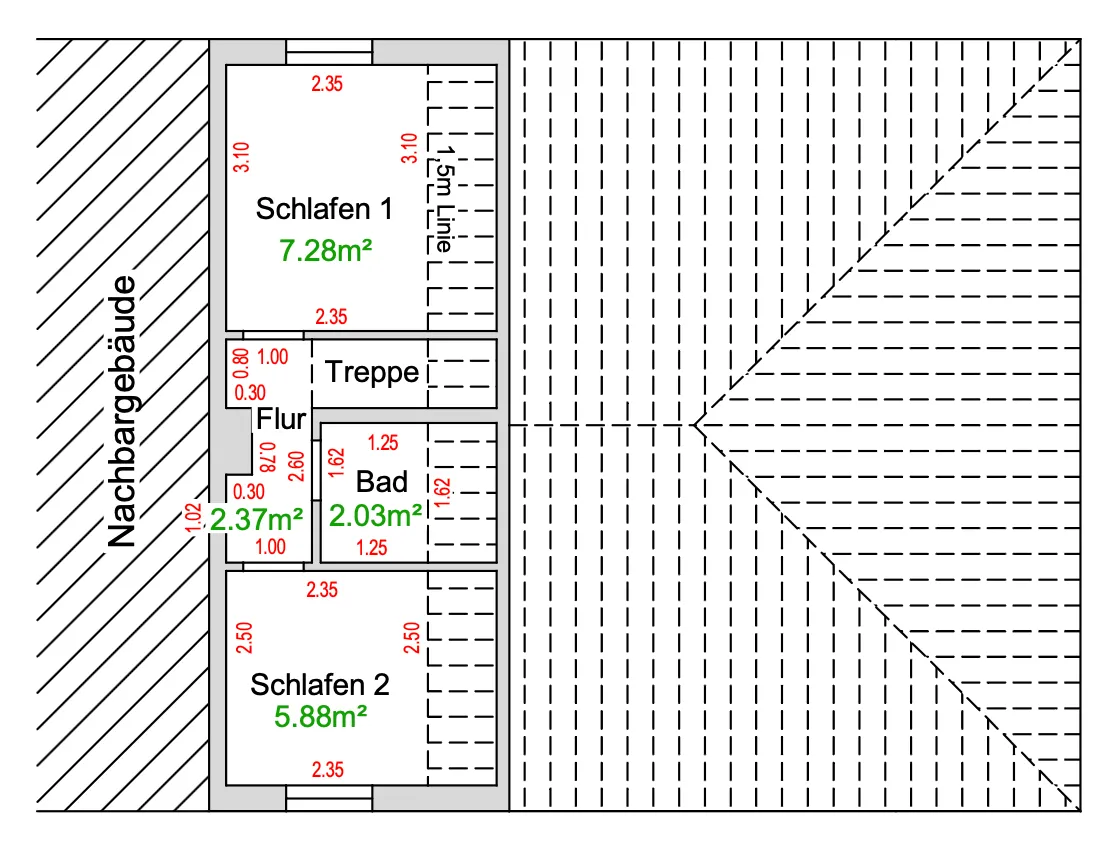Der Spitzboden ist ebenfalls ausgebaut, findet aber keine Berücksichtigung in der Wohnflächenberechnung. Hier sind zwei Schlafzimmer und ein Bad vorhanden.