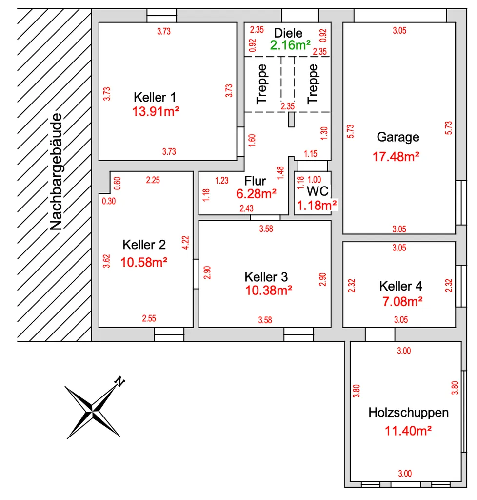 Der Keller umfasst vier Räume, ein separates WC sowie eine im Haus integrierte Garage.