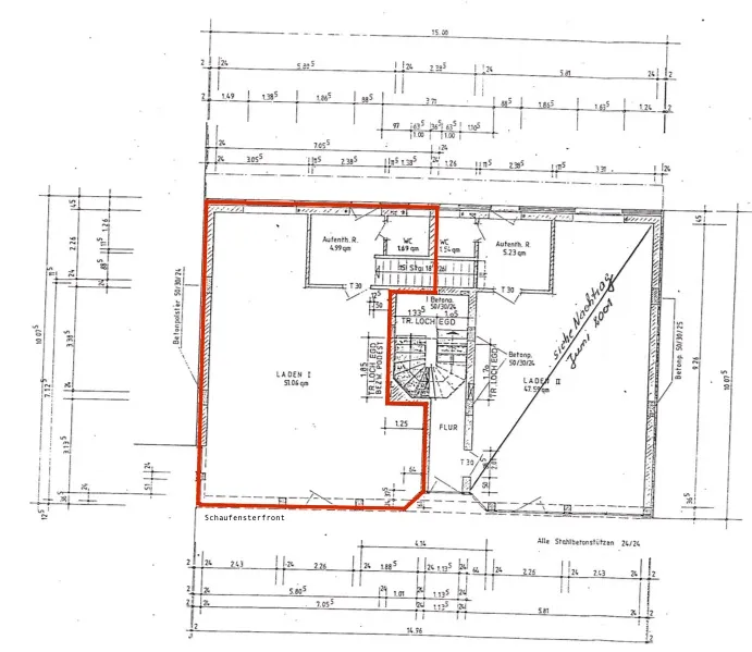 Derzeit ist das Ladenlokal aufgeteilt in ca. 50 qm Verkaufsraum, einem Aufenthaltsraum von ca. 5 qm sowie einem WC mit Waschbecken.