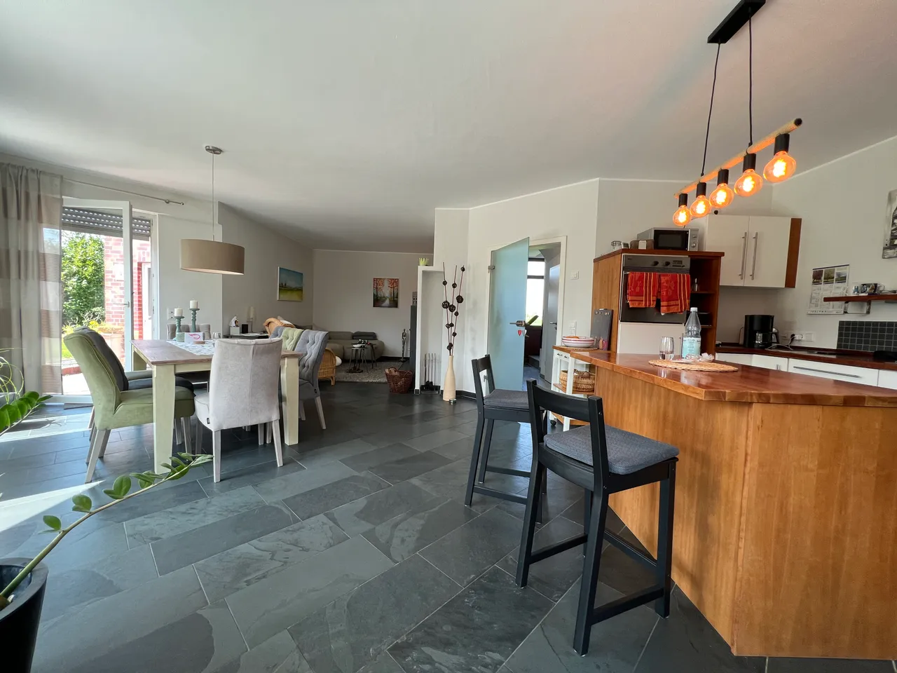 Über eine großzügige Diele gelangt man in das offene und lichtdurchflutete Wohn-/ Esszimmer mit integriertem Kochbereich. Terrasse und Garten können von hier aus betreten werden. Hier kann man in Ruhe, mit Blick auf Felder den Feierabend genießen. Abgerundet wird das Erdgeschoss durch ein Gäste-Wc, einen kleinen Abstellraum, ein Tageslichtbad mit Dusche und Wanne, ein Ankleideraum sowie ein Schlafzimmer.