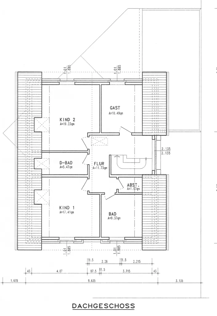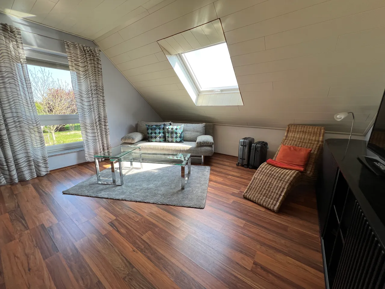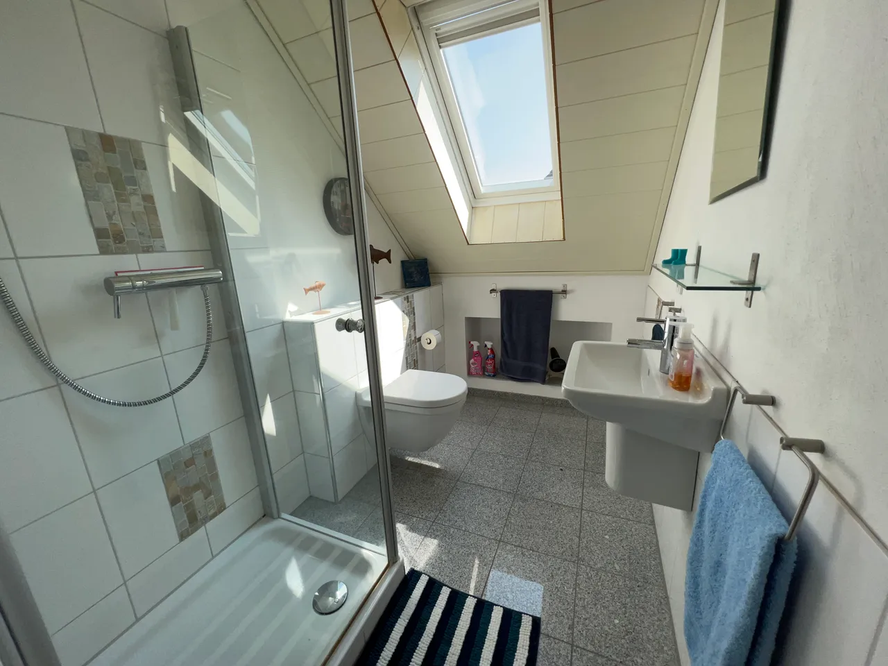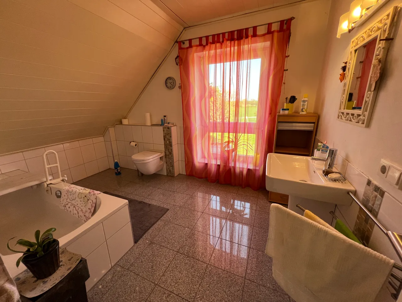 Genügend Raum findet man auch im Obergeschoss. Hier sind die Räume aktuell im Stil einer integrierten Wohnung angeordnet. Ca. 75 qm verteilen sich hier auf ein Wohnzimmer (oder Schlafzimmer), 2 weitere Schlafzimmer, ein Hauswirtschaftsraum, ein WC mit Dusche und ein größeres Bad mit Wanne. Über eines der beiden Schlafzimmer gelangt man in den Spitzboden, der derzeit als Abstellfläche genutzt wird.
