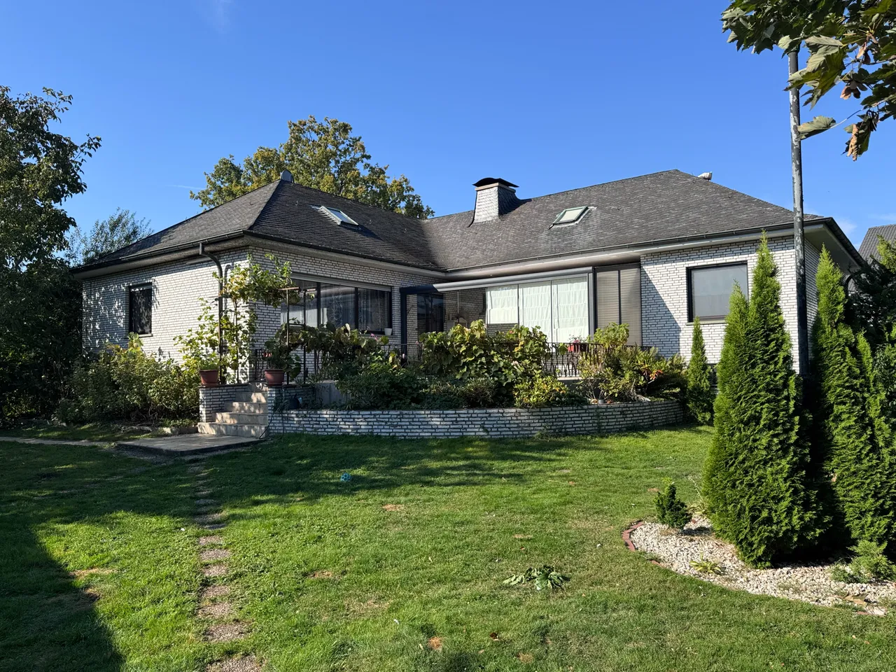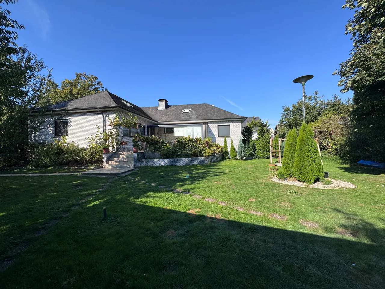 Mitten im Ort steht dieser ca. 153 m² (zzgl. ausgebautem Dachgeschoß, welches aktuell wohnwirtschaftlich genutzt) große freistehende Bungalow befindet sich auf einem Eckgrundstück, in einer Wohnstraße von Issum-Sevelen. Trotz der Ortskernlage hat man hier Ruhe und aufgrund der Größe des Grundstücks, ein hohes Maß an Privatsphäre.