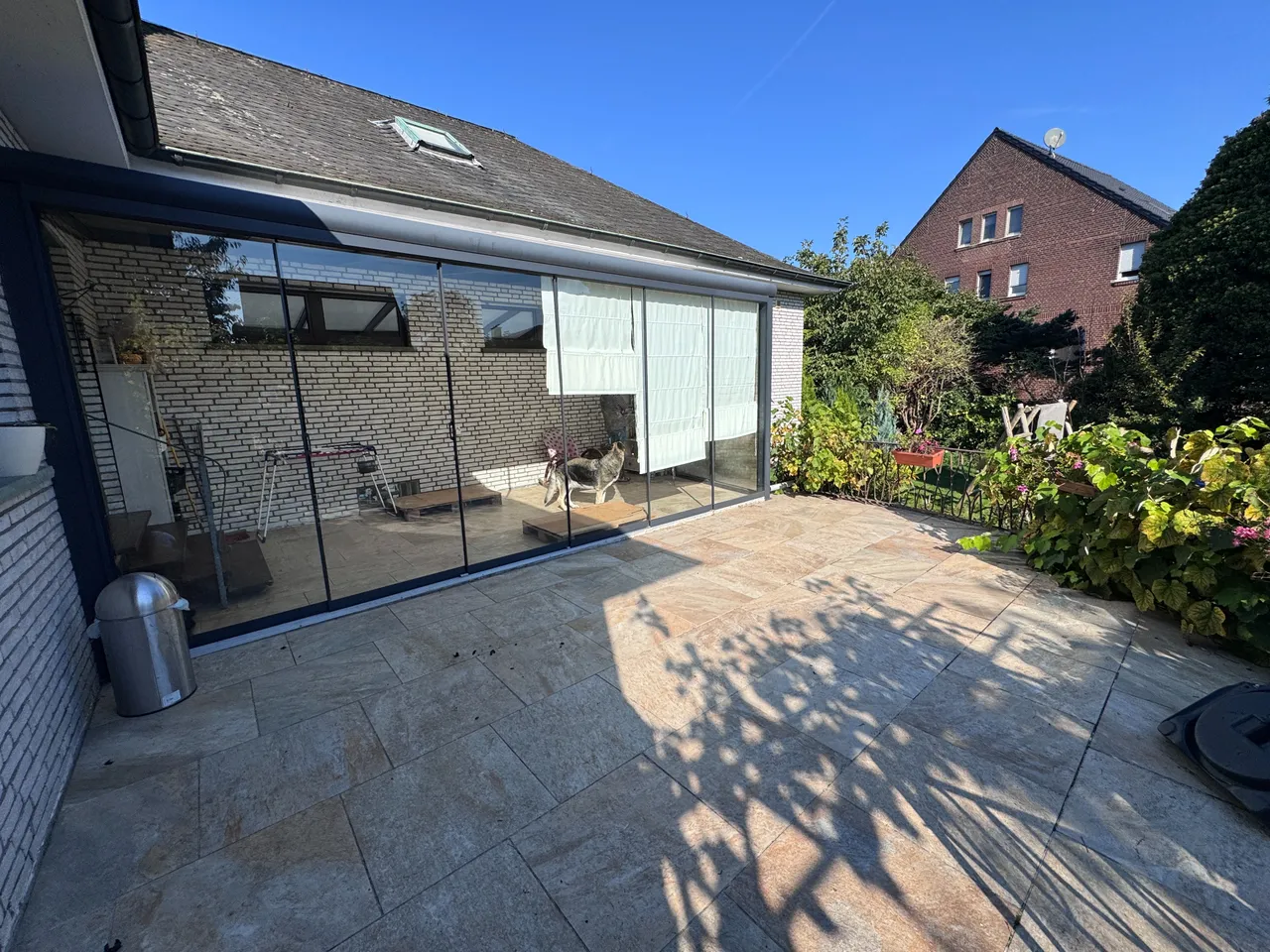 Von der Diele gelangen Sie über den Wintergarten direkt auf die Terrasse. Somit besteht die Möglichkeit, den umliegenden Garten auf vielfältige Weise zu nutzen. Der Garten verfügt derzeit über eine Sauna sowie ein Gartenhäuschen mit Überdachung, die auf Wunsch übernommen werden können (ebenso die Küche).