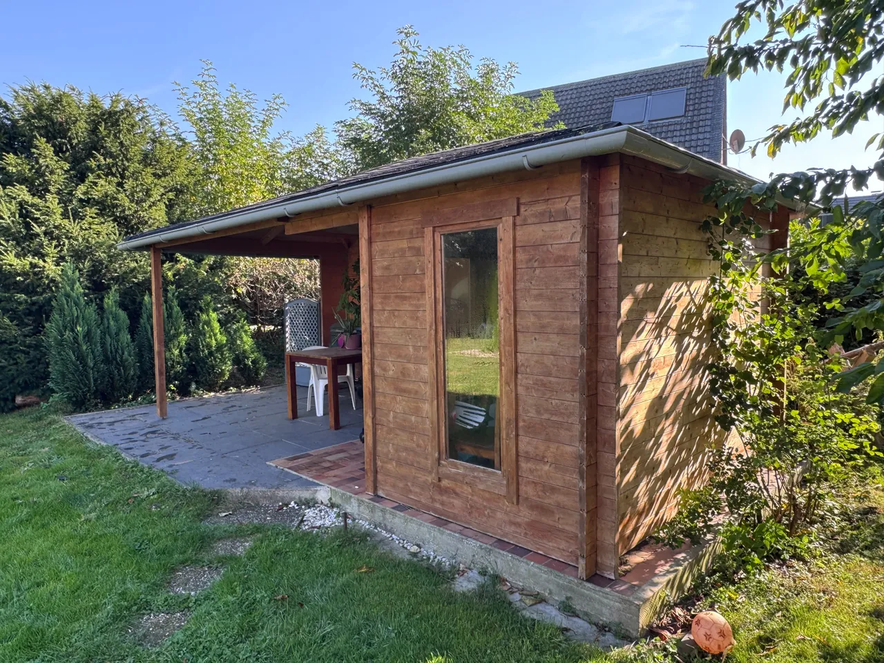 - Holzhaus mit Überdachung kann auf Wunsch übernommen werden (nicht im Kp enthalten)