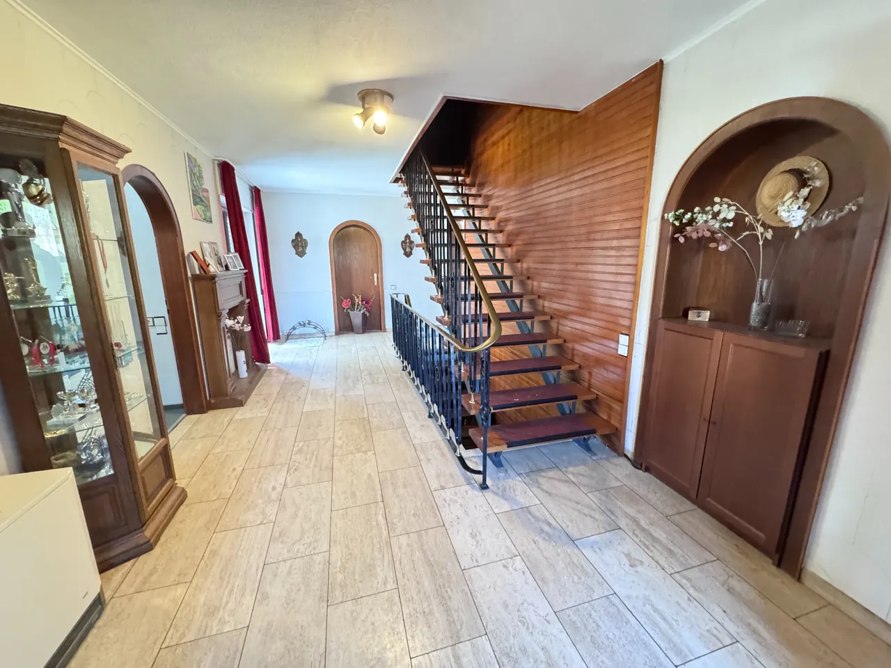 Zum Erdgeschoss zählen Wohnzimmer, Küche mit Zugang zum Balkon, Garderobe und Gäste-WC. Drei Schlafräume sowie das Tageslichtbad mit Dusche und Wanne sind über einen separaten Flur vom restlichen Wohnbereich abgetrennt.