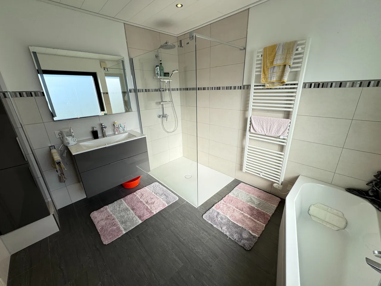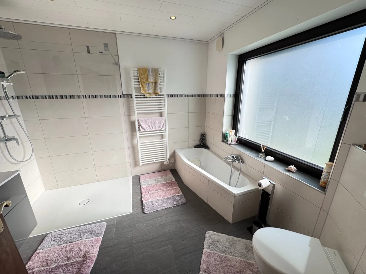 Bad mit Dusche, Wanne, Fenster |