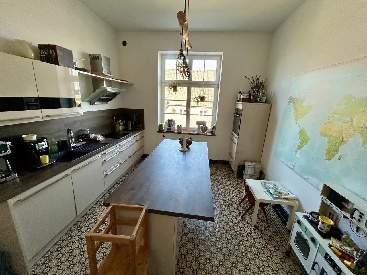 Die Wohnung befindet sich im Erdgeschoss (Hochparterre) mit hohen Decken, stilechten Fliesen und weiteren Extras wie z.B. das Traumbadezimmer. Das Highligt ist der große Wintergarten, der als erweitetes Wohnzimmer der ganzen Wohnung ein besonderes Flair verleiht. Eine Gartenfläche ist der Wohnung ebenso zugehörig wie ein kleiner Balkon mit Aussicht über die Felder. Abgerundet wird das Angebot durch den Stellplatz, der für 30 € mtl. angemietet werden kann.