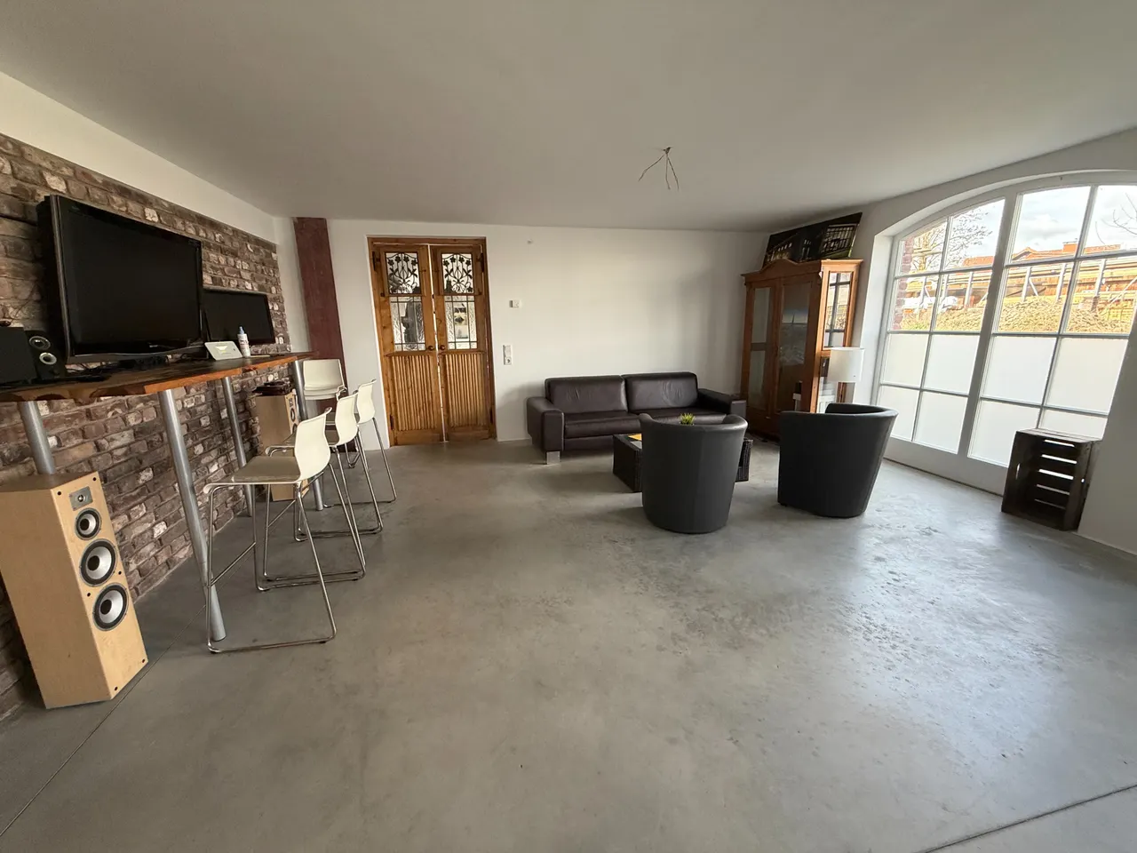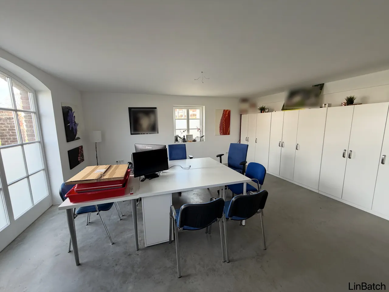 Die großzügigen Fensterflächen sorgen für eine helle und angenehme Arbeitsatmosphäre, während stilvolle Elemente wie die Backsteinwand dem Objekt einen besonderen Charakter verleihen.