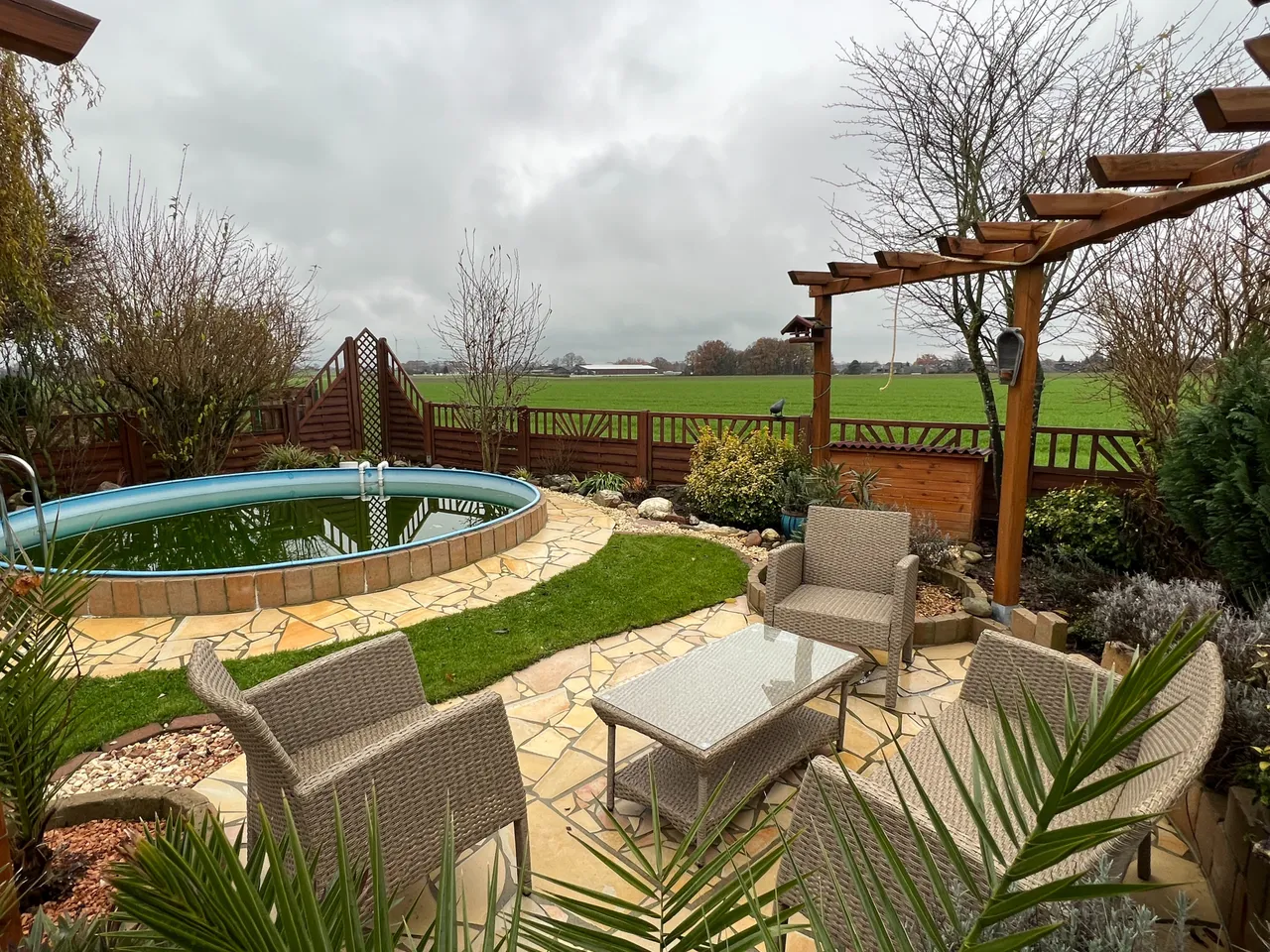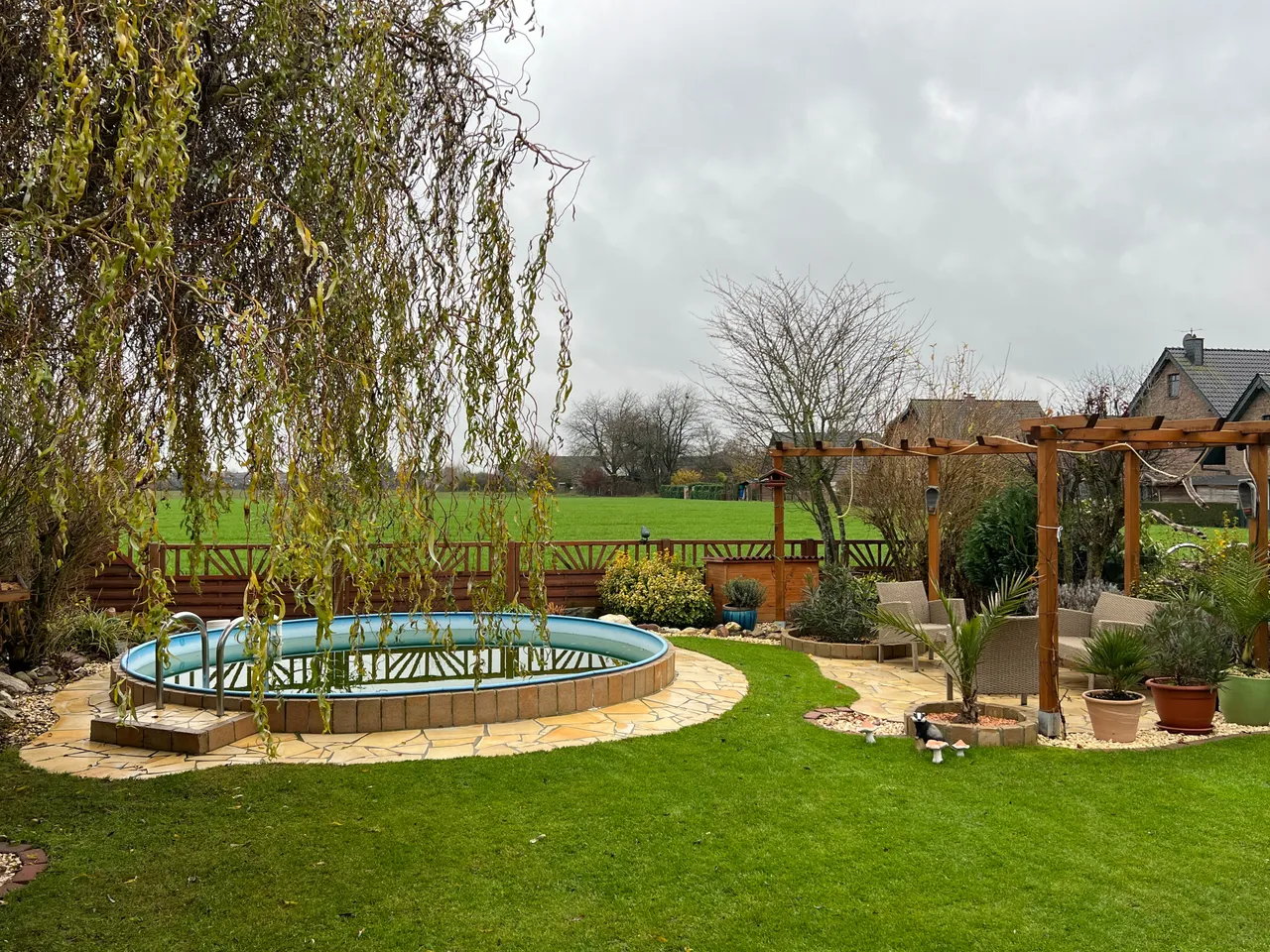 Diese sehr gepflegte Doppelhaushälfte wurde 2000 erbaut und verfügt über ca. 115 qm Wohn- Nutzfläche. Über die großzügige Diele erreicht man das Gäste-WC, die Küche und das große Wohn-/Esszimmer. Von hier gelangen Sie über die überdachte Terrasse in einen tollen Garten mit viel Privatsphäre. Am Pool mit angrenzender Sitzecke können Sie Ihre Sommerabende mit Blick über die Felder ausklingen lassen. Einen tollen Ausblick können Sie auch im Obergeschoss genießen, welches über 3 Schlafräume und ein Tageslichtbad mit Wanne und Dusche verfügt. Der erst vor 2 Jahren ausgebaute Spitzboden verfügt über einen weiteren großzügigen und hellen Schlafraum.