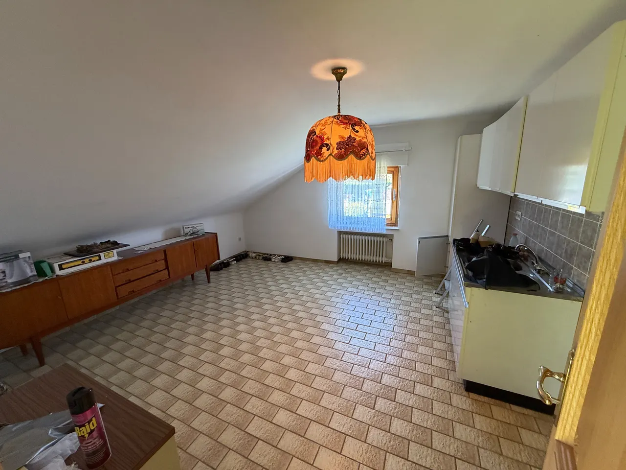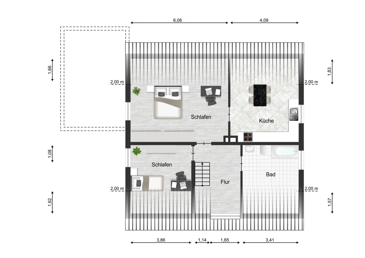 Auch das Dachgeschoss ist zur Wohnnutzung ausgebaut, wird jedoch als Nutzfläche (ca. 56 m²) angesehen. Hier genießen zwei Schlafräume, eine Küche und ein Tageslichtbad mit Wanne wohnwirtschaftlichen Nutzen. Bei einer etwaigen Sanierung durch den Käufer könnte man die Dachgeschossfläche auch zur offiziellen Wohnnutzung umnutzen lassen.