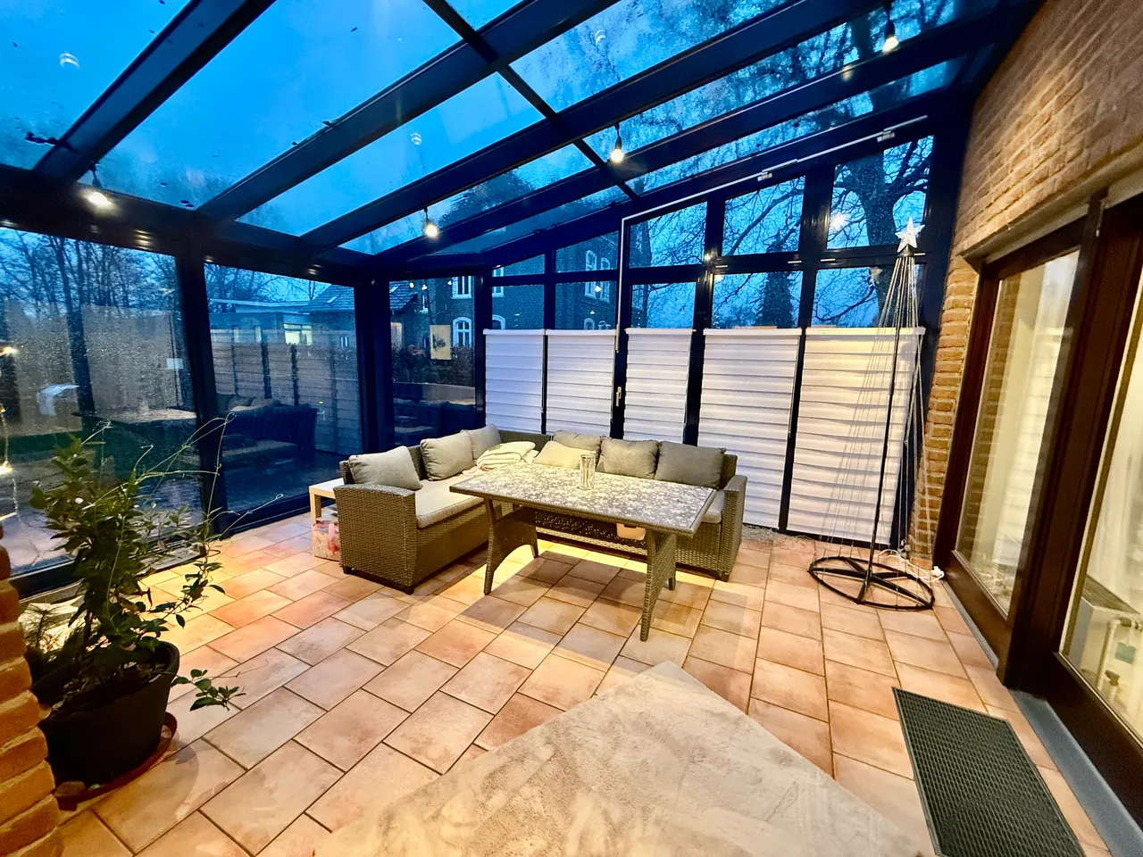 Der ganzjährig nutzbare Wintergarten bietet direkten Zugang zum pflegeleicht angelegten Garten mit Terrasse und schafft eine harmonische Verbindung zwischen Innen- und Außenbereich.